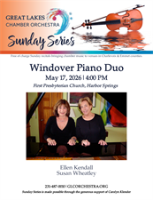 On Sunday, May 17 at 4 PM, Great Lakes Chamber Orchestra will present the Windover Piano Duo as part of their Sunday Series, featuring small chamber ensembles performing free of charge in community venues across northern Michigan. The free concert will take place at the First Presbyterian Church in Harbor Springs.